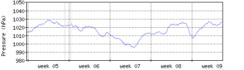 Der blaue Graph zeigt den mittleren Luftdruck, der Bereich zwischen grösstem und kleinstem Druck während des Messintervals ist in hellblau dargestellt. |