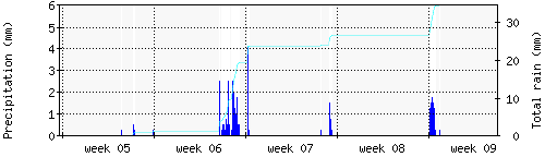 Das blaue Histogram zeigt die totale Niederschlagsmenge (oder deren Wassergehalt) in mm während des Messintervals. |