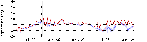 Die rote Kurve zeigt die Temperatur, die hellrote Fläche zeigt den Bereich zwischen höchsten und niedrigsten Temperatur während des Messintervals. Die blaue Kurve zeigt den Taupunkt, also die Temperatur, bei der sich Tau zu bilden beginnt. |