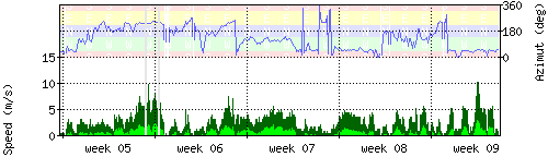 Der untere Teil des Graphen zeigt in hellgrün die mittlere Windgeschwindigkeit, die Spitzengeschwindigkeit ist dunkelgrün dargestellt, die zugehörige Skala findet sich am linken Rand. Der obere Teil des Graphen zeigt das Wind-Azimut in blau, die Skala steht am rechten Rand. |