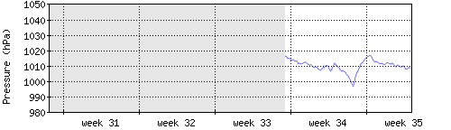 Der blaue Graph zeigt den mittleren Luftdruck, der Bereich zwischen grösstem und kleinstem Druck während des Messintervals ist in hellblau dargestellt. |