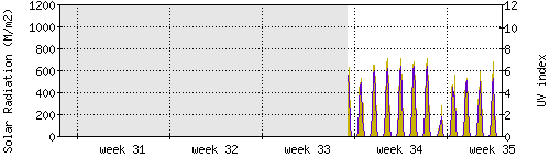 Das goldene Histogramm zeigt die totale Sonnestrahlung in W/m^2, die Skala befindet sich am linken Rand. Die violette Kurve zeigt den UV index, mit der Skala am rechten Rand. Man beachte, dass nach Schneefall die Messwerte nicht zuverlässig sind, weil die Sensoren nicht automatisch vom Schnee befreit werden. |