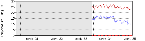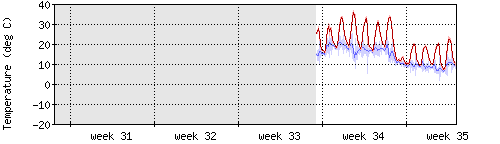 Die rote Kurve zeigt die Innentemperatur,die hellrote Fläche zeigt den Bereichh zwischen höchster und tiefster Temperatur während des Messzeitraums. |