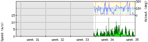 Der untere Teil des Graphen zeigt in hellgrün die mittlere Windgeschwindigkeit, die Spitzengeschwindigkeit ist dunkelgrün dargestellt, die zugehörige Skala findet sich am linken Rand. Der obere Teil des Graphen zeigt das Wind-Azimut in blau, die Skala steht am rechten Rand. |