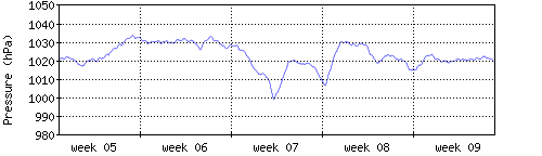 Der blaue Graph zeigt den mittleren Luftdruck, der Bereich zwischen grösstem und kleinstem Druck während des Messintervals ist in hellblau dargestellt. |