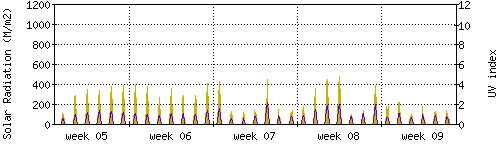 Das goldene Histogramm zeigt die totale Sonnestrahlung in W/m^2, die Skala befindet sich am linken Rand. Die violette Kurve zeigt den UV index, mit der Skala am rechten Rand. Man beachte, dass nach Schneefall die Messwerte nicht zuverlässig sind, weil die Sensoren nicht automatisch vom Schnee befreit werden. |