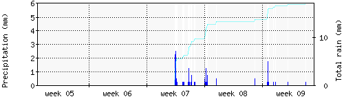 Das blaue Histogram zeigt die totale Niederschlagsmenge (oder deren Wassergehalt) in mm während des Messintervals. |