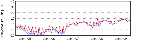 Die rote Kurve zeigt die Temperatur, die hellrote Fläche zeigt den Bereich zwischen höchsten und niedrigsten Temperatur während des Messintervals. Die blaue Kurve zeigt den Taupunkt, also die Temperatur, bei der sich Tau zu bilden beginnt. |