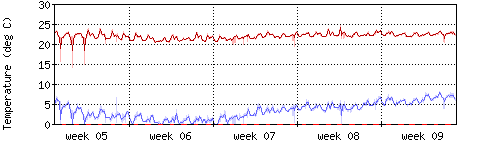 Die rote Kurve zeigt die Innentemperatur,die hellrote Fläche zeigt den Bereichh zwischen höchster und tiefster Temperatur während des Messzeitraums. |