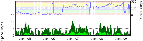 Der untere Teil des Graphen zeigt in hellgrün die mittlere Windgeschwindigkeit, die Spitzengeschwindigkeit ist dunkelgrün dargestellt, die zugehörige Skala findet sich am linken Rand. Der obere Teil des Graphen zeigt das Wind-Azimut in blau, die Skala steht am rechten Rand. |