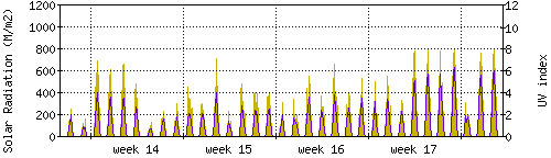 Das goldene Histogramm zeigt die totale Sonnestrahlung in W/m^2, die Skala befindet sich am linken Rand. Die violette Kurve zeigt den UV index, mit der Skala am rechten Rand. Man beachte, dass nach Schneefall die Messwerte nicht zuverlässig sind, weil die Sensoren nicht automatisch vom Schnee befreit werden. |