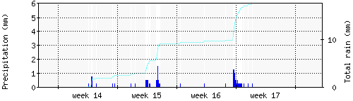 Das blaue Histogram zeigt die totale Niederschlagsmenge (oder deren Wassergehalt) in mm während des Messintervals. |