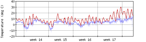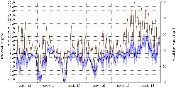 Die rote Kurve zeigt die Temperatur, die hellrote Fläche zeigt den Bereich zwischen höchsten und niedrigsten Temperatur während des Messintervals. Die blaue Kurve zeigt den Taupunkt, also die Temperatur, bei der sich Tau zu bilden beginnt. |