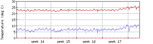 Die rote Kurve zeigt die Innentemperatur,die hellrote Fläche zeigt den Bereichh zwischen höchster und tiefster Temperatur während des Messzeitraums. |