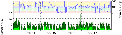 Der untere Teil des Graphen zeigt in hellgrün die mittlere Windgeschwindigkeit, die Spitzengeschwindigkeit ist dunkelgrün dargestellt, die zugehörige Skala findet sich am linken Rand. Der obere Teil des Graphen zeigt das Wind-Azimut in blau, die Skala steht am rechten Rand. |