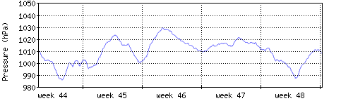 Der blaue Graph zeigt den mittleren Luftdruck, der Bereich zwischen grösstem und kleinstem Druck während des Messintervals ist in hellblau dargestellt. |