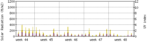 Das goldene Histogramm zeigt die totale Sonnestrahlung in W/m^2, die Skala befindet sich am linken Rand. Die violette Kurve zeigt den UV index, mit der Skala am rechten Rand. Man beachte, dass nach Schneefall die Messwerte nicht zuverlässig sind, weil die Sensoren nicht automatisch vom Schnee befreit werden. |