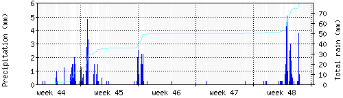 Das blaue Histogram zeigt die totale Niederschlagsmenge (oder deren Wassergehalt) in mm während des Messintervals. |