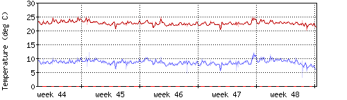Die rote Kurve zeigt die Innentemperatur,die hellrote Fläche zeigt den Bereichh zwischen höchster und tiefster Temperatur während des Messzeitraums. |