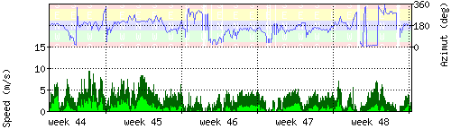 Der untere Teil des Graphen zeigt in hellgrün die mittlere Windgeschwindigkeit, die Spitzengeschwindigkeit ist dunkelgrün dargestellt, die zugehörige Skala findet sich am linken Rand. Der obere Teil des Graphen zeigt das Wind-Azimut in blau, die Skala steht am rechten Rand. |