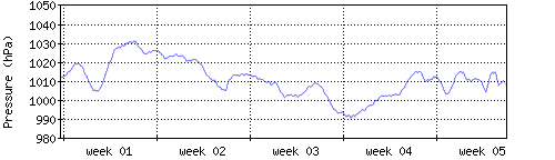 Der blaue Graph zeigt den mittleren Luftdruck, der Bereich zwischen grösstem und kleinstem Druck während des Messintervals ist in hellblau dargestellt. |