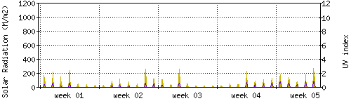 Das goldene Histogramm zeigt die totale Sonnestrahlung in W/m^2, die Skala befindet sich am linken Rand. Die violette Kurve zeigt den UV index, mit der Skala am rechten Rand. Man beachte, dass nach Schneefall die Messwerte nicht zuverlässig sind, weil die Sensoren nicht automatisch vom Schnee befreit werden. |