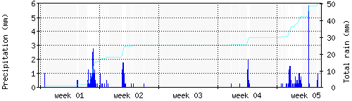 Das blaue Histogram zeigt die totale Niederschlagsmenge (oder deren Wassergehalt) in mm während des Messintervals. |