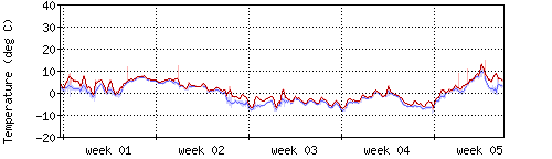 Die rote Kurve zeigt die Temperatur, die hellrote Fläche zeigt den Bereich zwischen höchsten und niedrigsten Temperatur während des Messintervals. Die blaue Kurve zeigt den Taupunkt, also die Temperatur, bei der sich Tau zu bilden beginnt. |