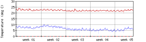 Die rote Kurve zeigt die Innentemperatur,die hellrote Fläche zeigt den Bereichh zwischen höchster und tiefster Temperatur während des Messzeitraums. |