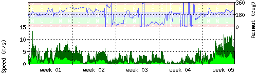 Der untere Teil des Graphen zeigt in hellgrün die mittlere Windgeschwindigkeit, die Spitzengeschwindigkeit ist dunkelgrün dargestellt, die zugehörige Skala findet sich am linken Rand. Der obere Teil des Graphen zeigt das Wind-Azimut in blau, die Skala steht am rechten Rand. |