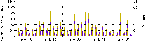 Das goldene Histogramm zeigt die totale Sonnestrahlung in W/m^2, die Skala befindet sich am linken Rand. Die violette Kurve zeigt den UV index, mit der Skala am rechten Rand. Man beachte, dass nach Schneefall die Messwerte nicht zuverlässig sind, weil die Sensoren nicht automatisch vom Schnee befreit werden. |