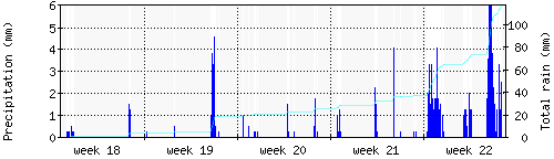 Das blaue Histogram zeigt die totale Niederschlagsmenge (oder deren Wassergehalt) in mm während des Messintervals. |