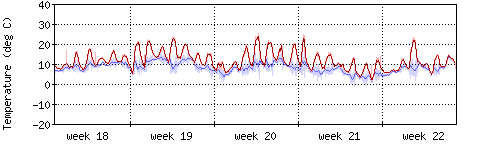 Die rote Kurve zeigt die Temperatur, die hellrote Fläche zeigt den Bereich zwischen höchsten und niedrigsten Temperatur während des Messintervals. Die blaue Kurve zeigt den Taupunkt, also die Temperatur, bei der sich Tau zu bilden beginnt. |