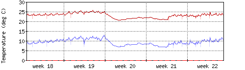 Die rote Kurve zeigt die Innentemperatur,die hellrote Fläche zeigt den Bereichh zwischen höchster und tiefster Temperatur während des Messzeitraums. |