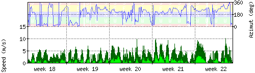 Der untere Teil des Graphen zeigt in hellgrün die mittlere Windgeschwindigkeit, die Spitzengeschwindigkeit ist dunkelgrün dargestellt, die zugehörige Skala findet sich am linken Rand. Der obere Teil des Graphen zeigt das Wind-Azimut in blau, die Skala steht am rechten Rand. |