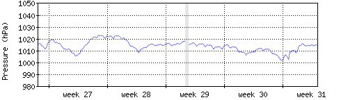 Der blaue Graph zeigt den mittleren Luftdruck, der Bereich zwischen grösstem und kleinstem Druck während des Messintervals ist in hellblau dargestellt. |