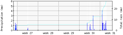 Das blaue Histogram zeigt die totale Niederschlagsmenge (oder deren Wassergehalt) in mm während des Messintervals. |