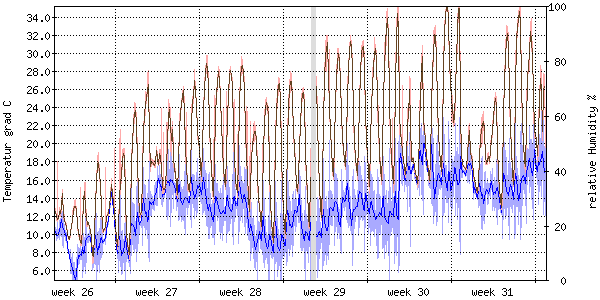 Die rote Kurve zeigt die Temperatur, die hellrote Fläche zeigt den Bereich zwischen höchsten und niedrigsten Temperatur während des Messintervals. Die blaue Kurve zeigt den Taupunkt, also die Temperatur, bei der sich Tau zu bilden beginnt. |