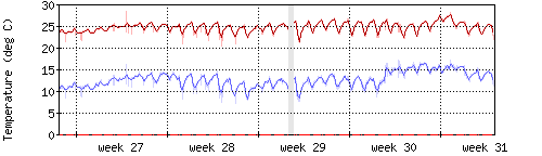 Die rote Kurve zeigt die Innentemperatur,die hellrote Fläche zeigt den Bereichh zwischen höchster und tiefster Temperatur während des Messzeitraums. |
