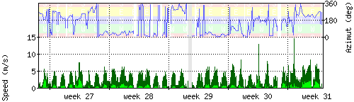 Der untere Teil des Graphen zeigt in hellgrün die mittlere Windgeschwindigkeit, die Spitzengeschwindigkeit ist dunkelgrün dargestellt, die zugehörige Skala findet sich am linken Rand. Der obere Teil des Graphen zeigt das Wind-Azimut in blau, die Skala steht am rechten Rand. |