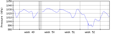 Der blaue Graph zeigt den mittleren Luftdruck, der Bereich zwischen grösstem und kleinstem Druck während des Messintervals ist in hellblau dargestellt. |