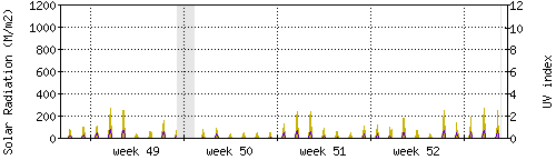 Das goldene Histogramm zeigt die totale Sonnestrahlung in W/m^2, die Skala befindet sich am linken Rand. Die violette Kurve zeigt den UV index, mit der Skala am rechten Rand. Man beachte, dass nach Schneefall die Messwerte nicht zuverlässig sind, weil die Sensoren nicht automatisch vom Schnee befreit werden. |