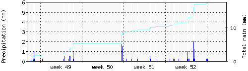 Das blaue Histogram zeigt die totale Niederschlagsmenge (oder deren Wassergehalt) in mm während des Messintervals. |