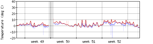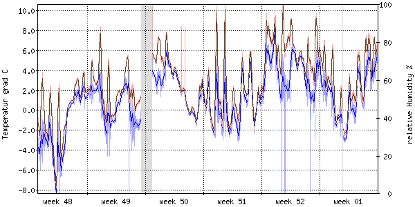 Die rote Kurve zeigt die Temperatur, die hellrote Fläche zeigt den Bereich zwischen höchsten und niedrigsten Temperatur während des Messintervals. Die blaue Kurve zeigt den Taupunkt, also die Temperatur, bei der sich Tau zu bilden beginnt. |