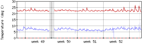 Die rote Kurve zeigt die Innentemperatur,die hellrote Fläche zeigt den Bereichh zwischen höchster und tiefster Temperatur während des Messzeitraums. |