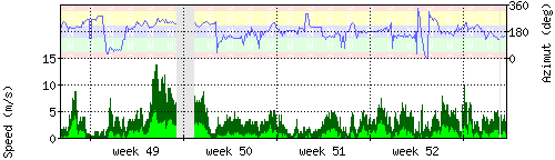 Der untere Teil des Graphen zeigt in hellgrün die mittlere Windgeschwindigkeit, die Spitzengeschwindigkeit ist dunkelgrün dargestellt, die zugehörige Skala findet sich am linken Rand. Der obere Teil des Graphen zeigt das Wind-Azimut in blau, die Skala steht am rechten Rand. |