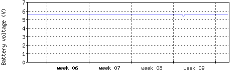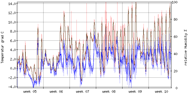 Die rote Kurve zeigt die Temperatur, die hellrote Fläche zeigt den Bereich zwischen höchsten und niedrigsten Temperatur während des Messintervals. Die blaue Kurve zeigt den Taupunkt, also die Temperatur, bei der sich Tau zu bilden beginnt. |