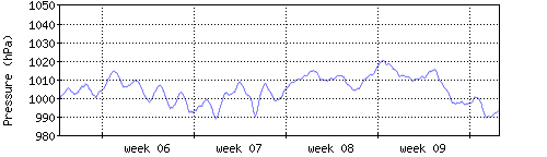 Der blaue Graph zeigt den mittleren Luftdruck, der Bereich zwischen grösstem und kleinstem Druck während des Messintervals ist in hellblau dargestellt. |