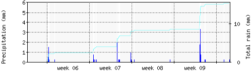 Das blaue Histogram zeigt die totale Niederschlagsmenge (oder deren Wassergehalt) in mm während des Messintervals. |