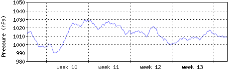 Der blaue Graph zeigt den mittleren Luftdruck, der Bereich zwischen grösstem und kleinstem Druck während des Messintervals ist in hellblau dargestellt. |